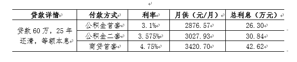 以贷款60万、25年还清(等额本息)为例做一个付款方式的横向对比:目前公积金个人住房贷款首套贷款利率为3.1%,相应的月供为2876.57元/月,利息总额为26.3万元;公积金二套贷款利率为3.575%,月供为3027.93元/月,利息总额为30.84万元;个人住房商业性贷款首套利率为4.75%(LPR+55个基点),相应的月供为3420.7元/月,利息总额为42.62万元。新标准施行后,从商贷首套转换为公积金首套每月可节省544元,总利息可节省16.32万元,从公积金二套转换为首套每月可节省151元,总利息可节省4.54万元。