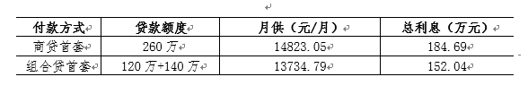 举个更为直观的例子,某职工要购买一套评估价为400万元的房屋,此前凭借商贷首套资格可以贷款260万,25年等额本息还款,月供为14823.05元/月,利息总额为184.69万。新标准施行后可以采用首套公积金组合贷款方式付款,假设公积金部分可贷120万,商贷部分贷140万,25年等额本息还款,月供为13734.79元/月,利息总额为152.04万。从纯商贷到公积金组合贷月供减少1088元,可节省总利息32.65万元,购房者还款负担和总购房成本都将有明显下降。