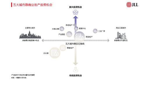 仲量联行中国区研究部总监姚耀表示:“五大城市群中的主要核心城市将在支撑传统的办公楼和零售地产市场的同时,催生产业园区、长租公寓等新兴投资机会;周边卫星城则将承接需求外溢,物流地产将迎重大利好,工业厂房、数据中心等也将获得投资者的关注。随着各物业类型的需求进一步演进,五大城市群将推动商业地产投资机会愈发多元化。”