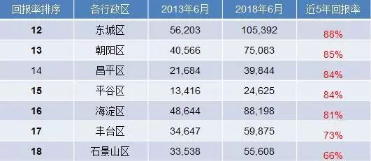 在过去五年北京房产投资回报率超过100%的有7个区县。