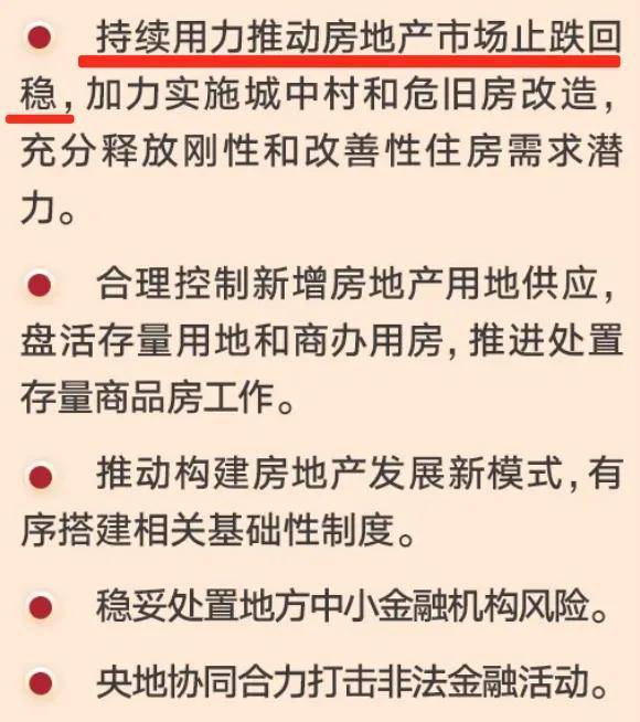 “持续用力推动房地产市场止跌回稳,加力实施城中村和危旧房改造,充分释放刚性和改善性住房需求潜力”。
