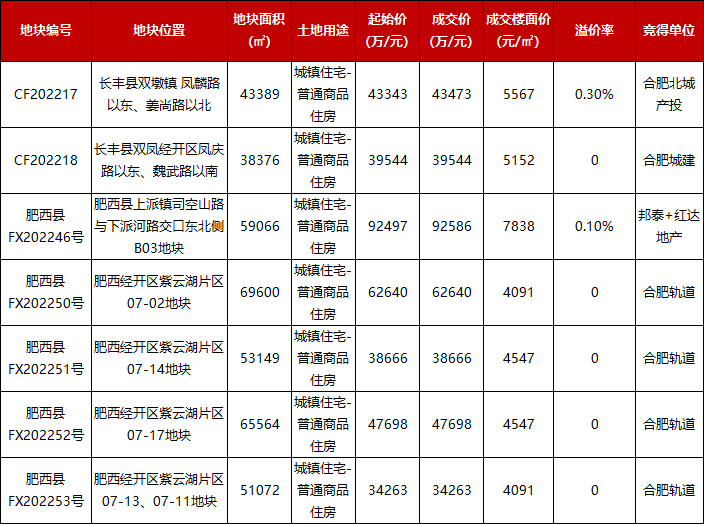 此外,肥东县FD202212号、FD202213号、FD202214号,肥西县FX202248号,长丰县CF202214号、CF202215号、CF202216号以及高新区GX202212号地块流拍。