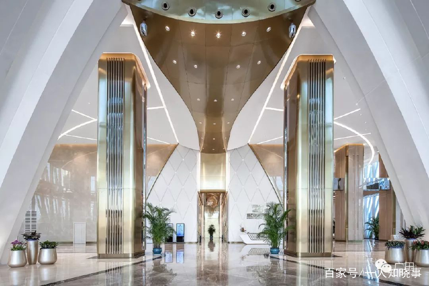 一楼大堂入口,巨大的弧形结构延续幕墙花瓣的流畅线条,延伸至室内。优雅的白色和金属质感装饰条,配以灯光的点缀,让整个空间明亮、大气、轻盈、灵动,现代感极强。