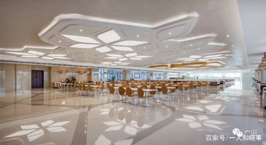 餐厅区,天花板花朵造型尤为惊艳,也是整栋大楼亮点突出的地方。此项目天花造型用到大量的弧形不锈钢。由于主楼整体造型接近竹笋,每层面积从下往上逐层递减,所以每层的不锈钢造型尺寸均不同,无形中影响下单准确性,增加了不锈钢的下单难度;餐厅天花花瓣造型原设计为木纹铝天花扣板,如有一丝偏差便装不上去,同样增加了下单难度和厂家生产难度,美观方面会显的花瓣更为厚重。经过协调沟通,采用了金属木纹漆的方式对花瓣进行了涂刷,即美观又实用,且提高了施工效率。