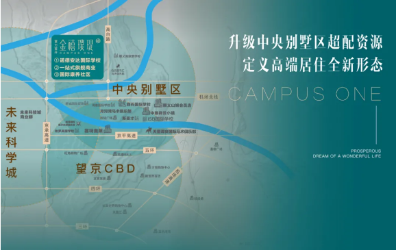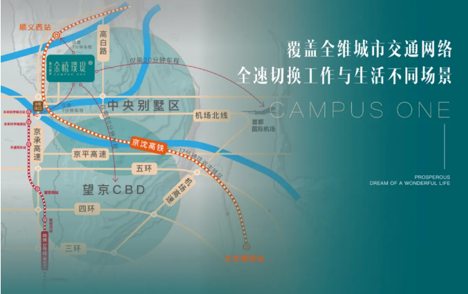 富力首开·金禧璞瑅位于京承高速8号出口(未来科学城出口)向北2公里。京承高速串联了大望京科技商务区、未来科学城、怀柔科学城的,也将成为北京最为重要的科创走廊。不仅驱车约15分钟直达首都国际机场,约20分钟快速通达朝阳、望京商务区、CBD等全城核心区域,满足工作与居住之间的迅速切换;而且板块 “三横三纵双轨一空”的立体交通网更织就无界城市脉络,全面实现企业、个人的高效出行。