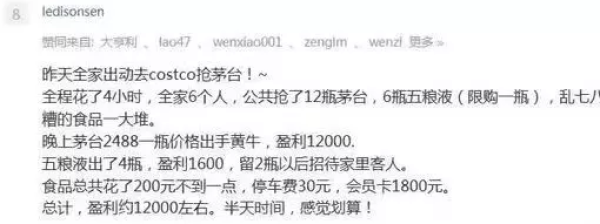 据一位消费者描述:“全家六口集体出动,耗时4小时,去Costco抢购茅台、五粮液,晚上再将其转手。12瓶茅台,4瓶五粮液共盈利13600元,减去停车费30元和6个人的会员费1800元,不到一天的时间盈利近12000元”。
