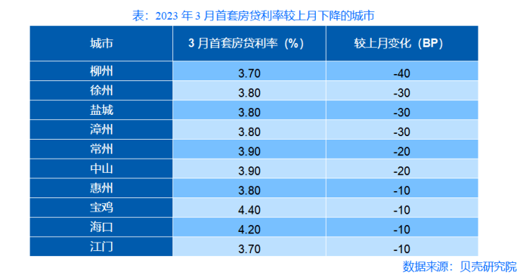 贝壳研究院分析人士认为,在首套住房贷款利率政策动态调整机制下,首套利率回调,二套利率保持不变,3月份首套与二套房贷利率价差扩大至89BP。从具体城市看,符合首套住房贷款利率政策动态调整机制的城市多在1、2月份下调首套房贷利率至4%以内,3月份降息城市数量在减少,仅柳州、徐州、盐城、漳州、常州、中山、惠州、宝鸡、海口、江门等10个三四线城市首套房贷利率下降。