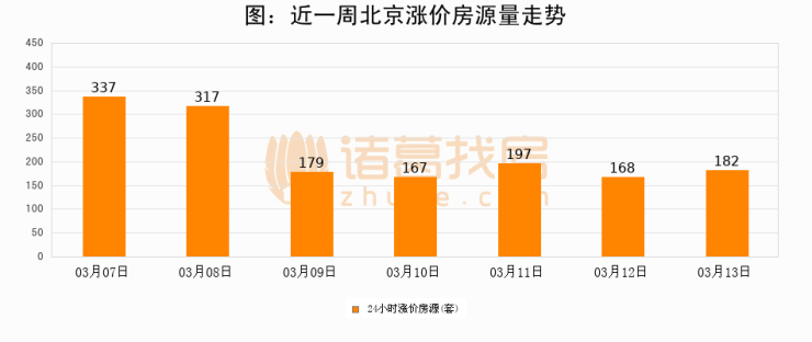 根据诸葛找房数据显示,北京24小时涨价房源量为182套,较03月12日增加14套,环比上涨8.3%。与此同时,涨价房源占比小幅扩大,业主信心有所提升。