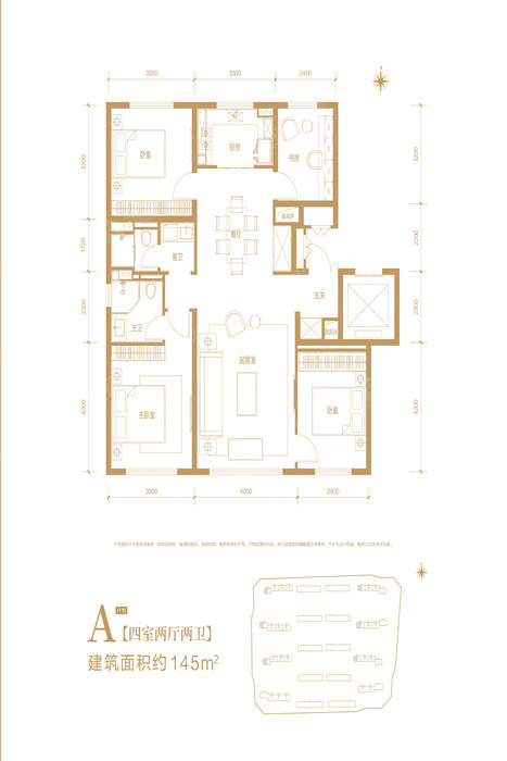 145平米为四室两厅两卫设计,三室朝南向,客厅面宽4.2米,居住舒适度优质,美中不足在客卫不带明窗,其他均带卫生间,通透性强,户型也十分方正。