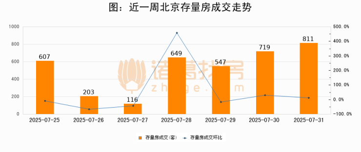 从存量房来看,2025年07月31日北京存量房单日成交811套,比昨日增加92套,环比上涨12.8%。从近一周存量房成交来看,北京存量房日均成交套数为521套,07月31日单日成交811套,高于近一周平均水平55.7%。