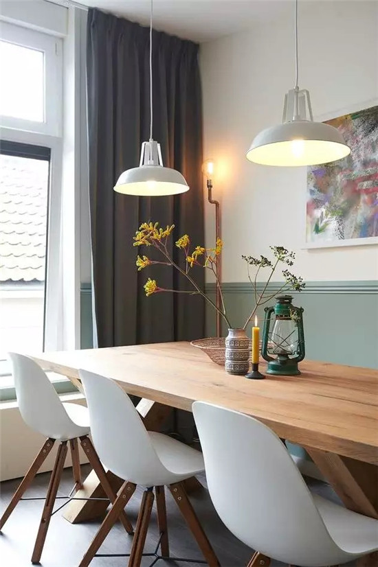 白色+绿色,浅绿是墙面搭配鲜花与木质餐桌,清新舒适,还相当漂亮。