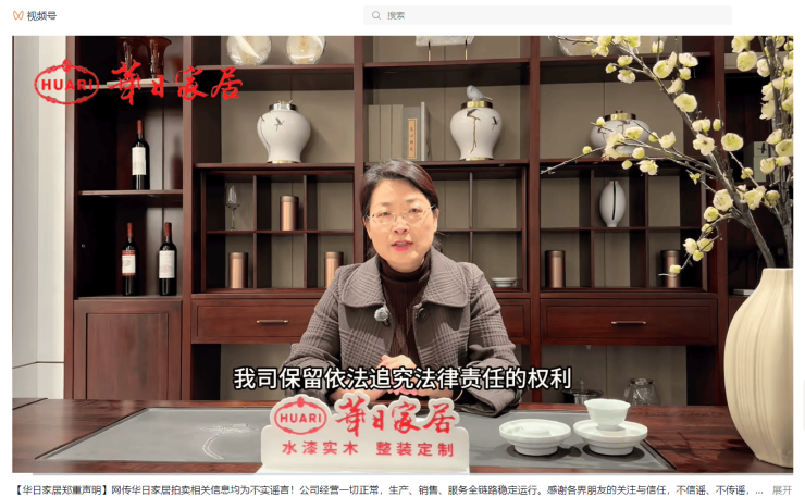 1月23日,国内实木家具品牌华日家居行政总裁刘喆发布声明视频,就近日网传“华日拍卖应收账款”“停业清算”等不实言论作出正式回应。