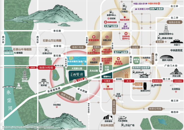 坐拥五横六纵扇面立体交通路网,周边世纪城金源、翠微百货、石景山万达、五棵松华熙live、丽泽天街,5大核芯商圈环绕。在这里,城市烟火与时尚生活相互交织,无需驾车即可享受高品质的商业配套,满足全家全龄段品质需求,随时随地悦享内城繁华。