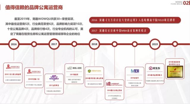 窝趣诞生于铂涛集团,并获58同城和华平投资中国实体的战略投资,引入会员、供应链、流量、资金等战略资源。截至2019年,窝趣WOWQU共获30+荣誉奖项,其中较佳运营商5次、行业典范荣誉6次、品牌影响力奖项10次、十佳公寓品牌4次、品牌排行榜4次。行业专业机构的认可,奠定了窝趣在租赁住房和公寓运营管理领域领导企业的地位。且2016窝趣《交互设计在大堂的运用》入选哈佛商学院FIELD项目课程,2017窝趣轻社区被中国MBA商业案例库收录,2019年,在《住宅与房地产》《现代物业》等学术期刊上发表论文。