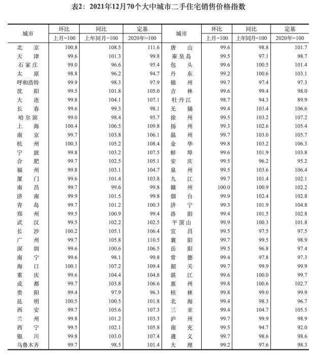 2021年12月70个大中城市二手住宅销售价格指数。截图自国家统计局官网