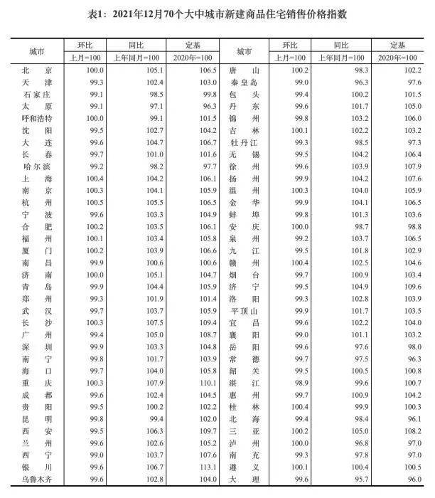 2021年12月70个大中城市新建商品住宅销售价格指数。截图自国家统计局官网