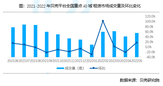 根据贝壳研究院数据,5月全国重点40城租赁成交量环比增加17.6%。整体来看,5月重点40城里有36个城市的租赁市场成交量环比增加。主要原因是当月疫情防控形势好转,部分受抑制的租赁需求开始陆续释放,加之新增需求不断“入场”,推高住房租赁市场的热度,长春、哈尔滨等个别城市租赁成交迎来大幅增长。