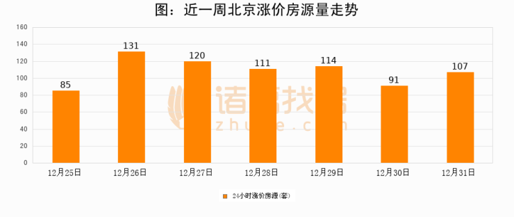 根据诸葛找房数据显示,北京24小时涨价房源量为107套,较12月30日增加16套,环比上涨17.6%。与此同时,涨价房源占比小幅扩大,业主信心有所提升。