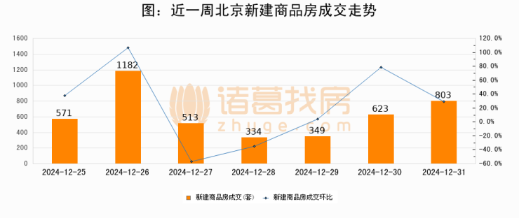 根据北京市住房和城乡建设委员会数据显示,2024年12月31日北京新建商品房成交803套,较昨日增加180套,环比上涨28.9%。近一周北京新建商品房日均成交625套。12月31日单日成交803套,高于近一周平均水平28.5%。