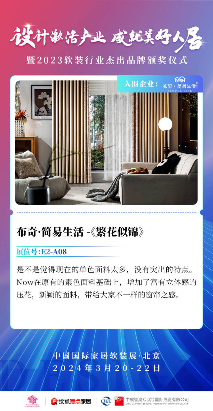 海宁布奇纺织有限公司作为中国家居软装行业的优秀代表,踊跃参与并成功入围“2023年度软装行业杰出品牌”,其也将携布奇·简易生活系列产品参展BWFE2024。海宁布奇纺织有限公司董事长吕勤峰告诉搜狐焦点家居,海宁布奇纺织有限公司,以创新为源动力,以品牌为基石,以服务为至高点,将窗帘的功能与装饰完美演绎,因“帘”更温暖,因“帘”更念家!布置完美家居,缔造品质生活!