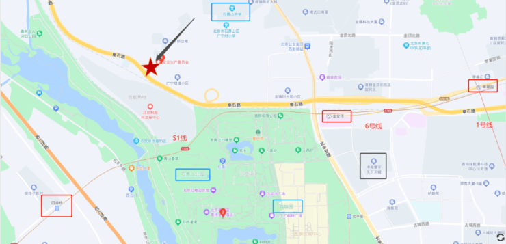地块位于五环和六环之间,阜石路的北侧,不到500米就是首钢园。区域内有三条地铁线路:距离6号线&S1号线金安桥站约1.4km,一站换乘1号线,距11号线模式口站约2.7km。