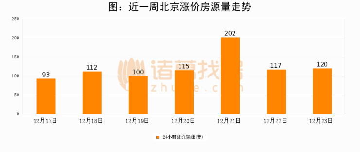 根据诸葛找房数据显示,北京24小时涨价房源量为120套,较12月22日增加3套,环比上涨2.6%。与此同时,涨价房源占比小幅扩大,业主信心有所提升。