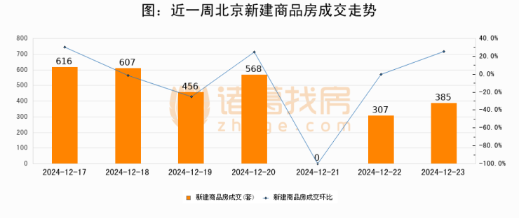 根据北京市住房和城乡建设委员会数据显示,2024年12月23日北京新建商品房成交385套,较昨日增加78套,环比上涨25.4%