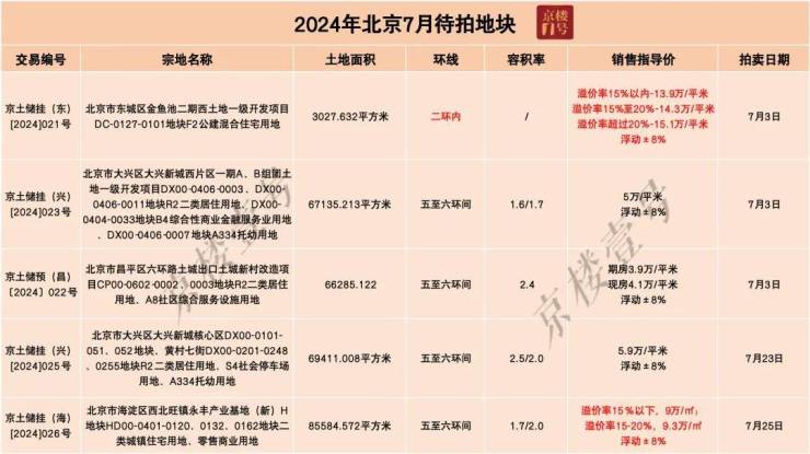 7月北京一共5宗地块将入市。