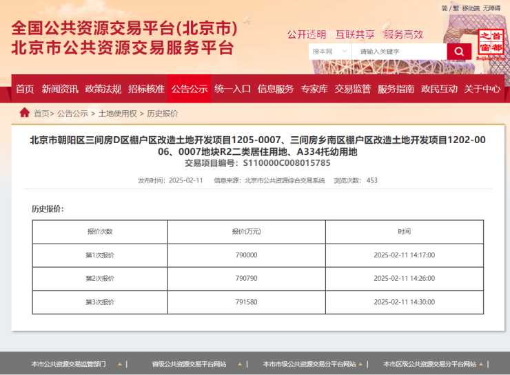 此外,据中指研究院消息,2月11日的土拍现场竞争激烈,“保利发展+中国金茂”联合体、中海地产、招商蛇口三家竞买人举牌超过百轮。不过,每经记者2月15日查询北京市公共资源交易服务平台发现,上述地块的土拍过程没有线上直播,历史报价记录只有3次,2月11日14时17分第一次报出79亿元底价,14时26分第二次出价为79.079亿元,14时30分第三次出价为79.158亿元。