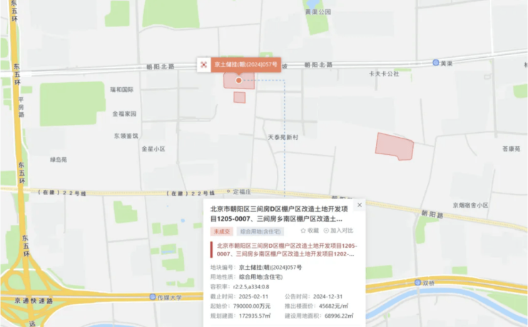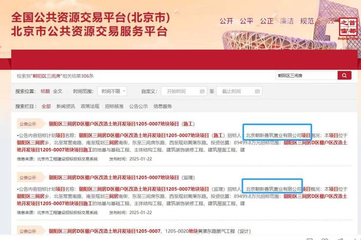 起因是今年1月22日北京市公共资源交易服务平台发布的招标公告。公告显示,“朝阳区三间房D区棚户区改造土地开发项目1205-0007地块项目(施工)”招标人是北京朝新善筑置业有限公司,预计招标公告发布日期为2月24日,投资估算为8.95亿元。