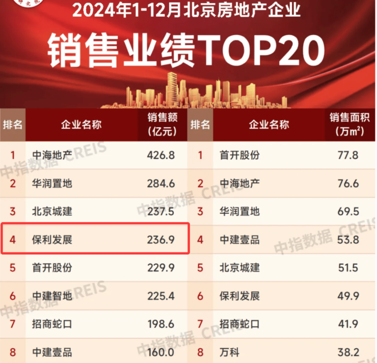 尽管保利发展2024年全口径销售额仍保持行业第一,但其在北京的市场表现却不尽如人意。据中指研究院数据,2024年保利发展以236.9亿元销售额排名北京房企销售业绩榜第四位,与榜首企业相差约190亿元;权益销售金额为147.6亿元,排在中海地产、中建智地、华润置地、北京城建之后,名列北京房企第五位。
