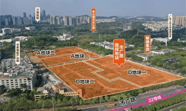 此次敏捷集团拿下的4宗地块均位于番禺区钟村街市广路,包括隆辉A地块(一、二)和隆辉D地块(一、二),总用地面积约8.5万平方米,计算容积率建筑面积为23.56万平方米。4宗地块的起始价分别约为6.06亿元、6.02亿元、8.80亿元和12.29亿元,折合楼面价约为1.41万元/平方米。