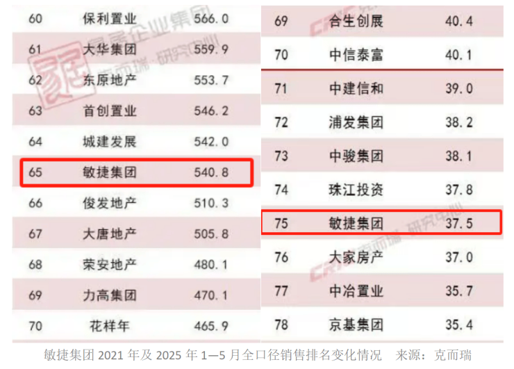据克而瑞发布的房企销售排行榜,2021年敏捷集团以540.8亿元的全口径销售额排在行业第六十五位。2022年至2024年,敏捷集团分别以370.7亿元、165.4亿元和106.2亿元的全口径销售额,排在行业第七十三位、第八十和第七十八位。今年前5月,敏捷集团以37.5亿元的全口径销售额排在行业第七十五位。