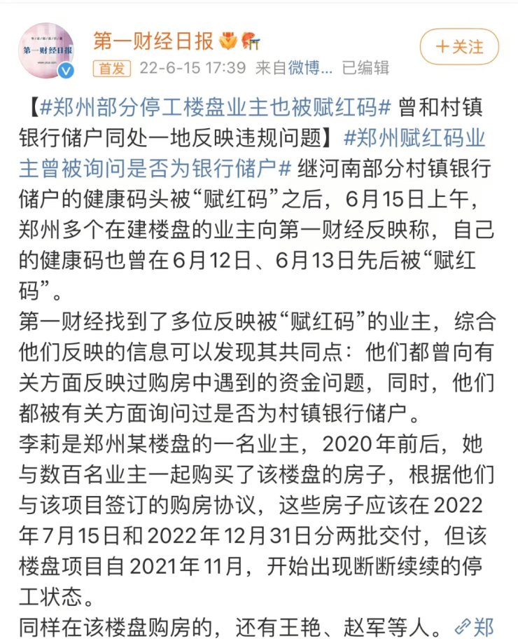 又有一波人的健康码莫名其妙变红了,他们的身份是几个停工楼盘的业主。