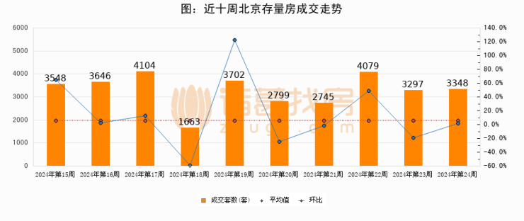 存量房方面,第24周北京存量房成交3348套,较上周增加51套,环比上涨1.6%。从近十周成交走势来看,周均成交套数为3293套,本周高于平均水平1.7%。