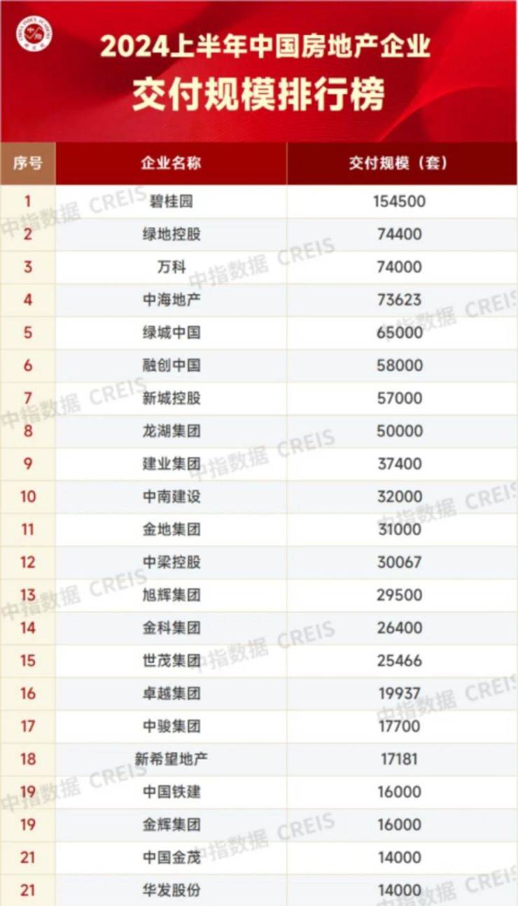 据中指研究院7月11日发布的《2024年上半年中国房地产企业交付规模排行榜》的数据,碧桂园、绿地控股、万科的交付套数分别为15.45万套、7.44万套和7.4万套,位居该榜单前三名。