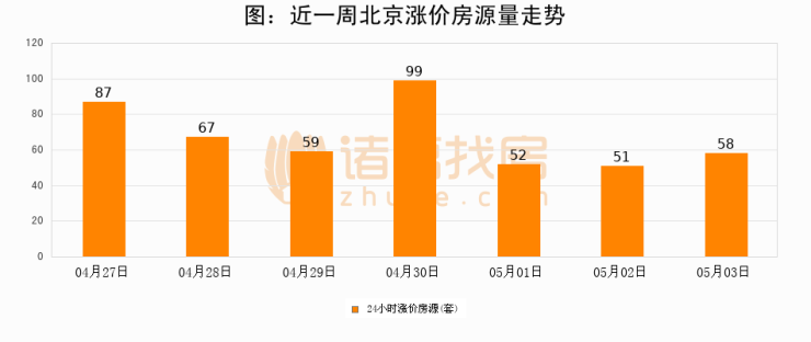 根据诸葛找房数据显示,北京24小时涨价房源量为58套,较05月02日增加7套,环比上涨13.7%。与此同时,涨价房源占比小幅扩大,业主信心有所提升。