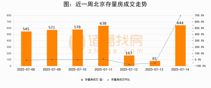 从存量房来看,2025年07月14日北京存量房单日成交644套,比昨日增加563套,环比上涨695.1%。从近一周存量房成交来看,北京存量房日均成交套数为460套,07月14日单日成交644套,高于近一周平均水平40%。