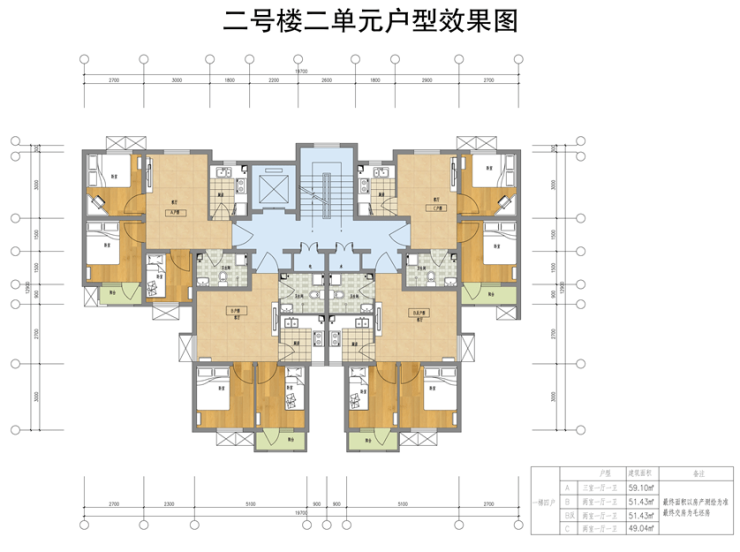 本次可配租房源共计20套,中套型(两室一厅)20套,建筑面积约51.6-53.46平方米。租金标准为18元/建筑平方米·月。