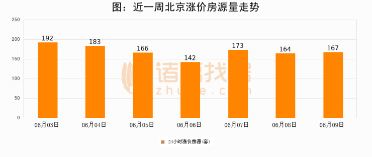 根据诸葛找房数据显示,北京24小时涨价房源量为167套,较06月08日增加3套,环比上涨1.8%。与此同时,涨价房源占比小幅扩大,业主信心有所提升。