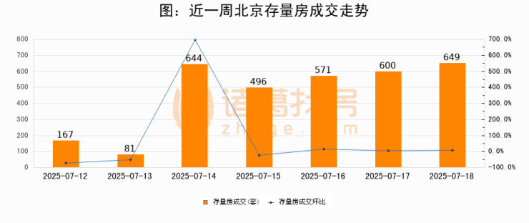 从存量房来看,2025年07月18日北京存量房单日成交649套,比昨日增加49套,环比上涨8.2%。从近一周存量房成交来看,北京存量房日均成交套数为458套,07月18日单日成交649套,高于近一周平均水平41.7%。