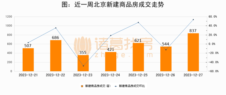 根据北京市住房和城乡建设委员会数据显示,2023年12月27日北京新建商品房成交837套,较昨日增加293套,环比上涨53.9%。近一周北京新建商品房日均成交568套。12月27日单日成交837套,高于近一周平均水平47.4%。