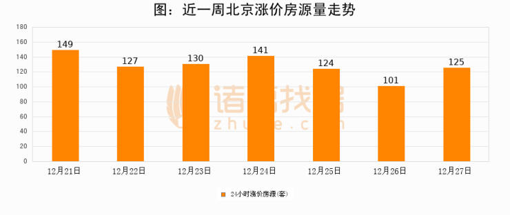 根据诸葛找房数据显示,北京24小时涨价房源量为125套,较12月26日增加24套,环比上涨23.8%。与此同时,涨价房源占比小幅扩大,业主信心有所提升。