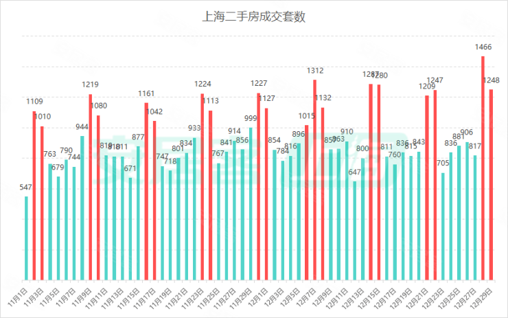 网上房地产数据显示,12月28日(周六),上海单日二手房网签成交1466套,超越10月13日的1334套,创年内二手房单日成交新纪录。12月29日(周日),网签成交量仍维持高位,成交套数1248套,周末两日共计成交套数达2714套,亦成为年内成交套数最多的一个周末。