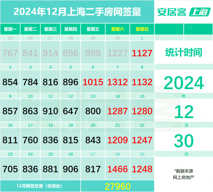 根据网上房地产数据统计,截至12月29日,单月上海二手房(含商业)的网签成交已超过2.7万套,达27960套,环比上涨了8.3%。