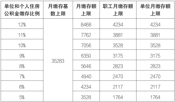 《通知》指出,2024住房公积金年度继续执行5%至12%的缴存比例政策,缴存单位可根据可自身情况在5%至12%范围内自主确定缴存比例。2024住房公积金年度住房公积金月缴存基数上限为35283元,月缴存基数下限为2420元,领取基本生活费职工的月缴存基数下限为1694元。