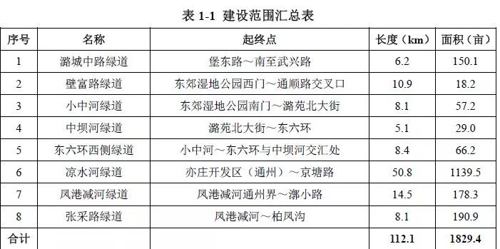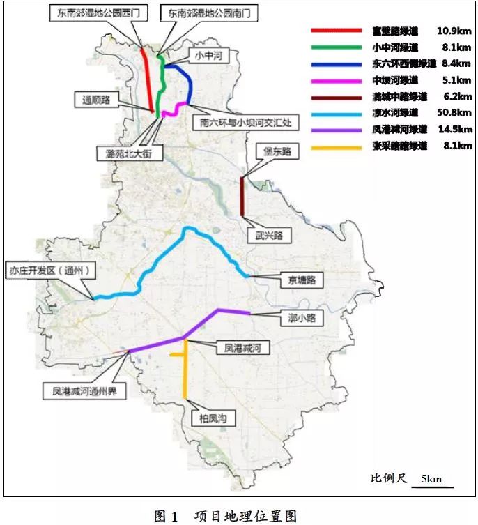 建设范围及地理位置:本项目位于通州区,共计实施8条绿道,包含潞城中路绿道、壁富路绿道、小中河绿道、中坝河绿道、东六环西侧绿道、凉水河绿道、凤港减河绿道以及张采路绿道,绿道选线长度共计