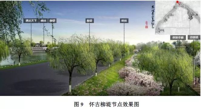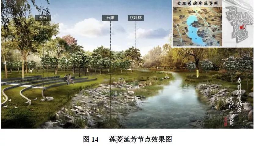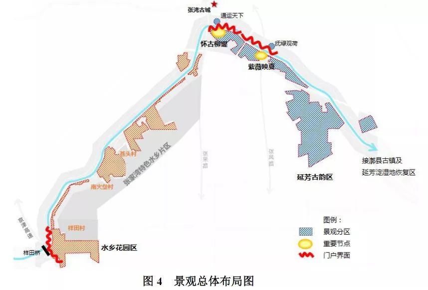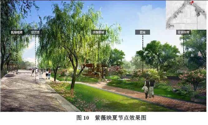 本项目总体景观结构为两区两点——两区:水乡花园区、延芳古韵区;两点:怀古柳堤节点、紫薇映夏节点。形成“闻香漫步莲菱远,缘溪骑行水乡近。古渡凭栏风拂柳,红楼一梦醉花荫。”的设计特色。