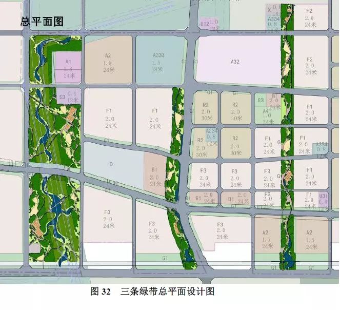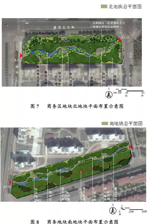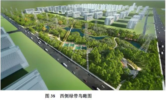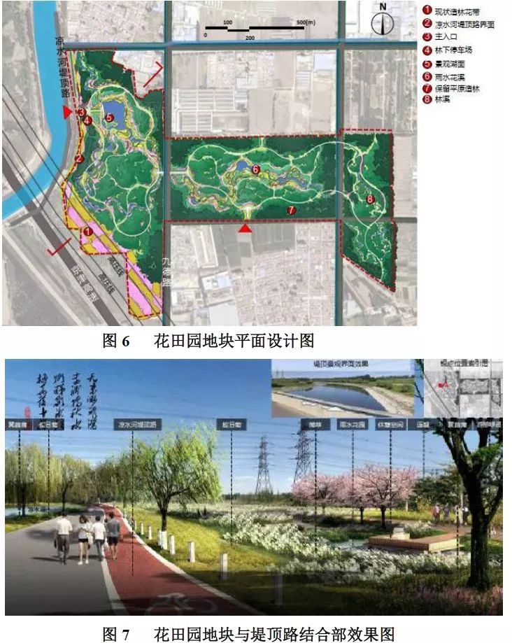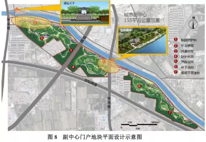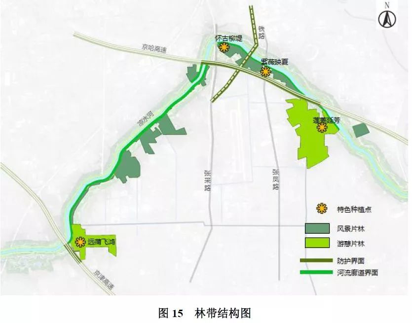 本地块定位为强调展示性的高品质风景林带。北部形成一条面向副中心的展示界面,南侧形成高品质的景观片林。仅在与张凤路、张采路相接处设计两处节点,形成怀古柳堤、紫薇映夏节点。