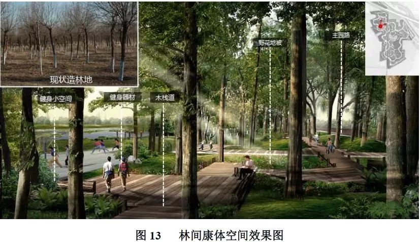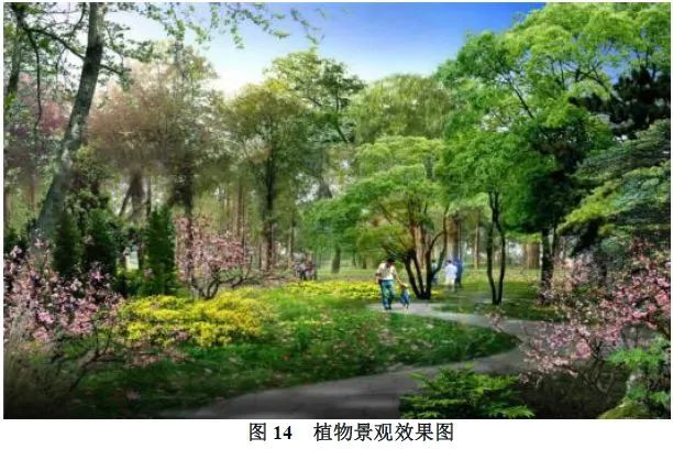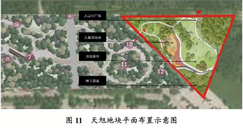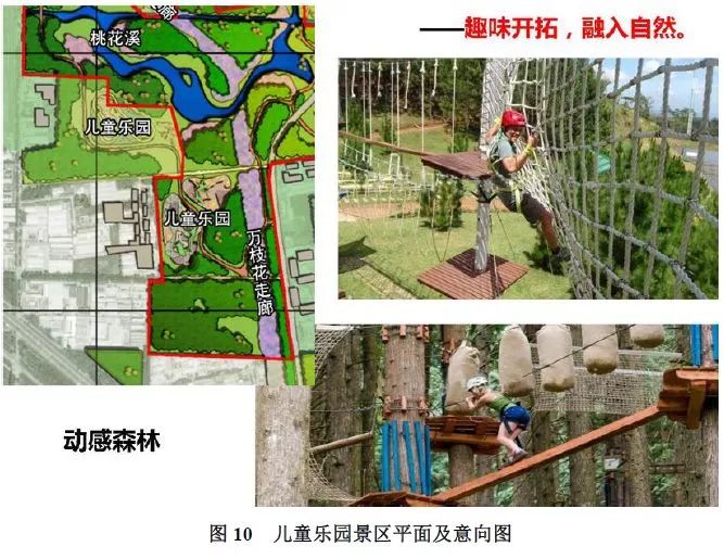 儿童乐园景区位于公园西北侧。在林下增加活动场地,设置多种类型的儿童游憩设施。景点平面图及意向图如下图10: